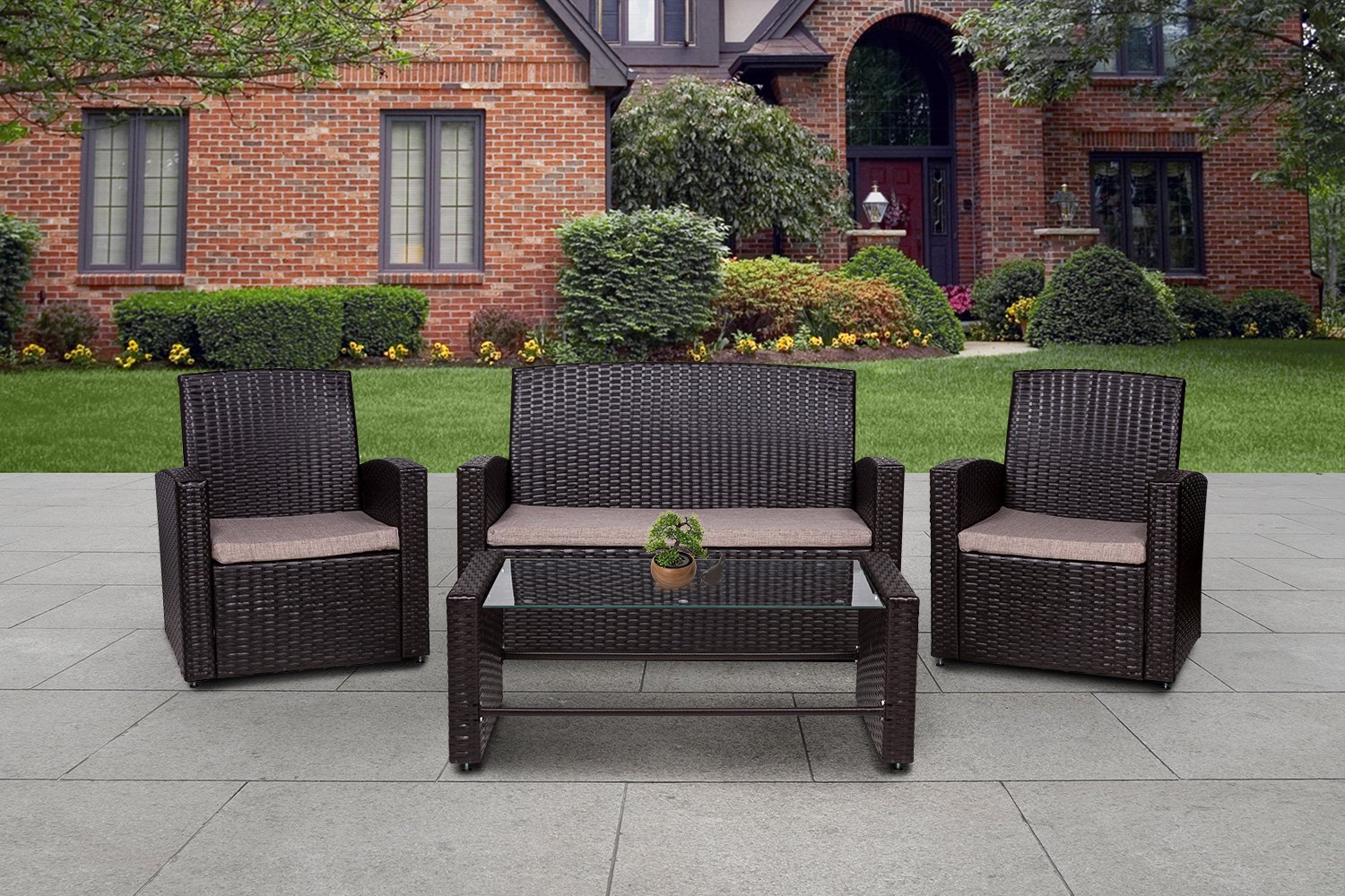 Набор «Джулия» состоит из столика, двух кресел и дивана. Цвет готового изделия – оплетка цвета венге (темное, почти черное дерево), и коричневые (темно-бежевые) подушки и матрасы.
